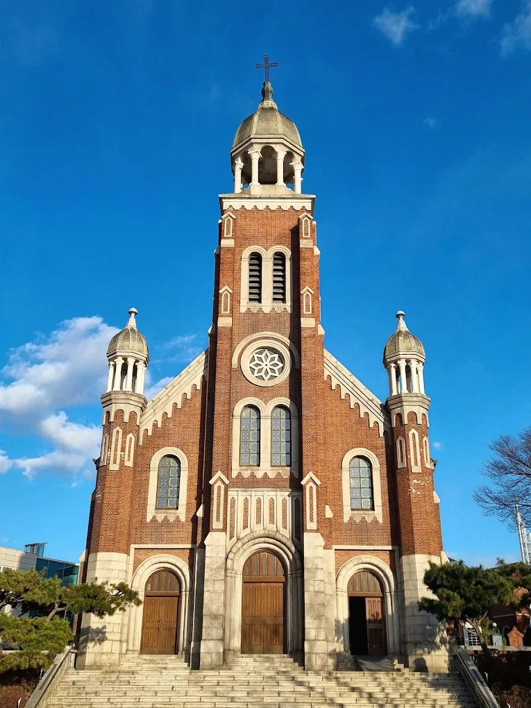 성당 앞의 조형물, 성모 마리아상, 붉은 벽돌 외벽은 계절과 날씨에 따라 전혀 다른 분위기를 연출하며, SNS 인증샷 포인트로 각광받고 있습니다.